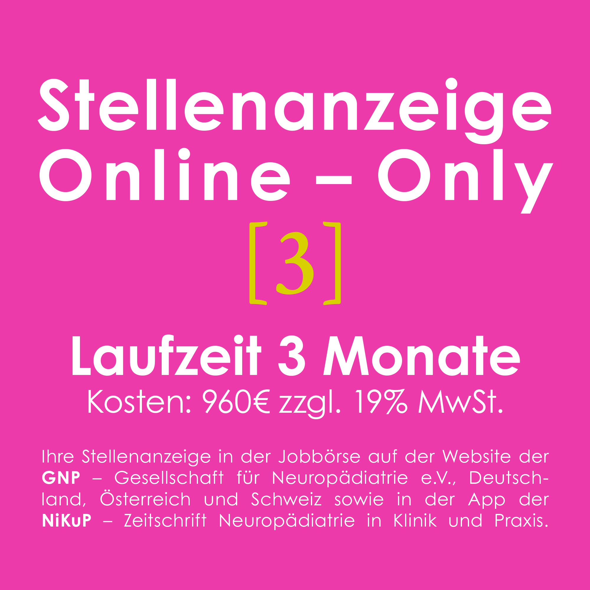 Ihre Stellenanzeige erscheint 3 Monate lang auf der Website der GNP unter https://gesellschaft-fuer-neuropaediatrie.org/jobs/ sowie in der NiKUP-App (Google Play Store / App Store). Start der Veröffentlichung direkt nach Abschluss des Bestellvorgangs.